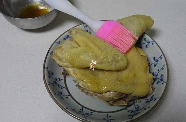 第五步;之後在雞的表皮上面刷上少許芝麻油,稍微等一會表皮就會吸幹,這個時候就可以斬塊瞭。
