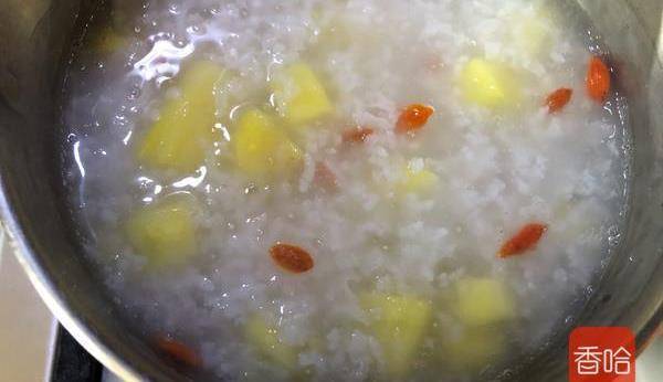 大米50克、小西米50克、菠蘿150克、清水1300毫升、冰糖適量、枸杞適量