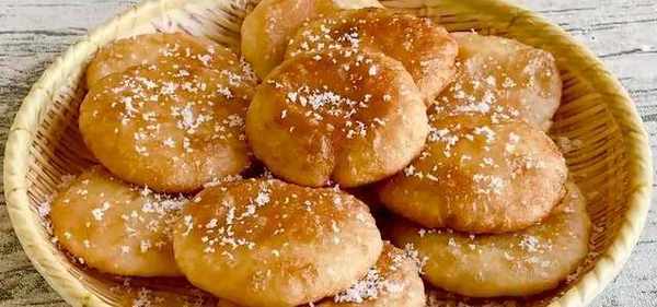 大傢看漂亮,完瞭出鍋,咱一盤油炸湯糕就做好瞭,來嘗一嘗舒服。入口的瞬間就感覺他的笑。好吃,給大傢展示一下你的糖糕。不用年糕面,也不用糯米面,照樣軟糯香甜,非常好吃,這個真的值得一試。