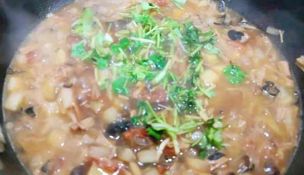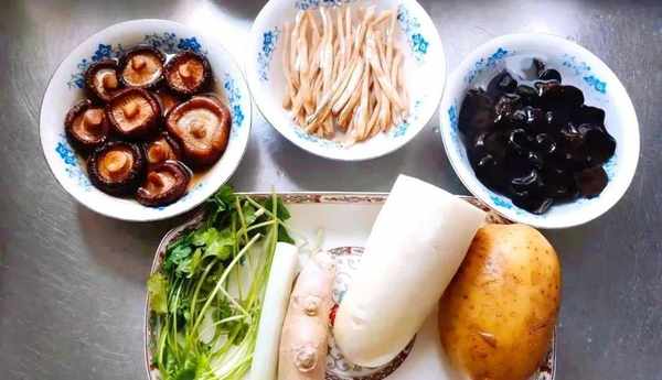 2、香菇洗幹凈切成丁;幹菜花用溫水浸泡10分鐘後洗凈切成丁;木耳提前泡發30分鐘後洗凈切成丁;土豆去皮後切成丁;白蘿卜去皮切成丁;蔥,切蔥花;薑,切成薑絲;香菜洗凈切碎。所有食材準備就緒,備用。