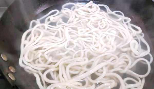 10、面餅醒好後,取一鍋,註入清水,燒開,然後,將面餅切成條狀,而後用雙手拉成條子下入鍋中,煮熟。