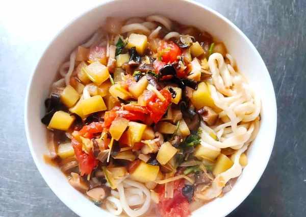 臊子面上桌瞭,味道鮮美很是誘人,吃上一口,酸香開胃特別好吃,不知不覺吃瞭兩碗,真是味美。