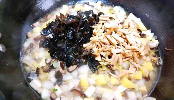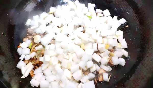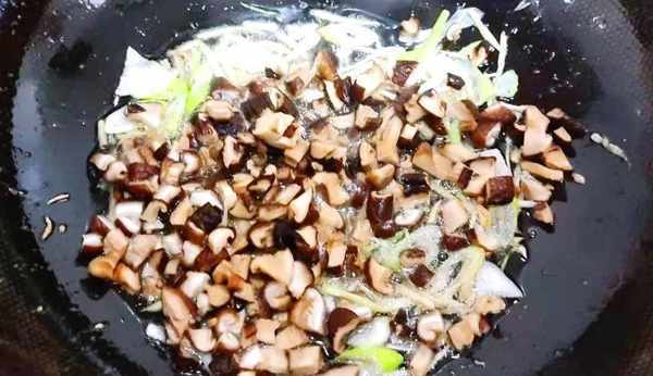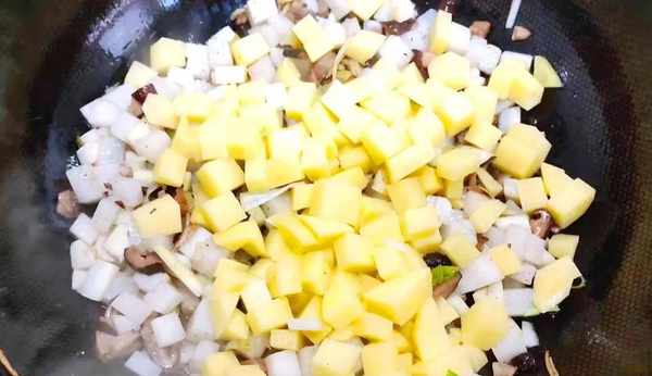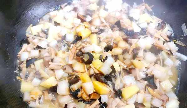 4、然後,放入香菇丁,中火,翻炒出香味;加入白蘿卜丁,翻炒均勻;加入土豆丁,繼續翻炒均勻後,加入適量的溫水,燉煮3-5分鐘。這樣做以上的食材成熟度一致。