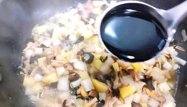 6、而後,加入幹菜丁和木耳丁,加入1勺醬油,翻炒均勻。