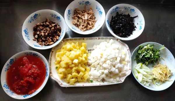 所需食材:面粉,香菇,幹菜,木耳,土豆,白蘿卜,蔥,薑,香菜,西紅柿醬,鹽,醬油,食用油