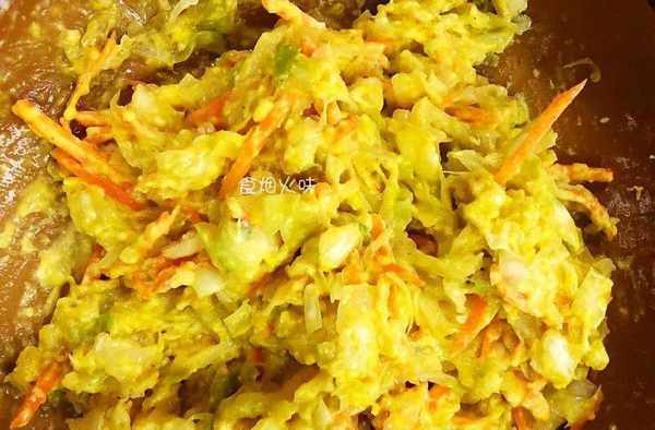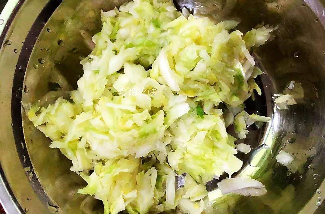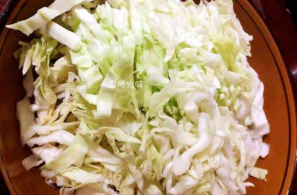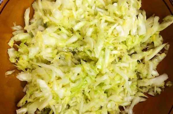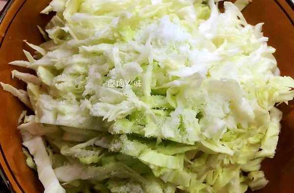 2.切好的包菜絲放在盆中,加入一勺食鹽,用筷子攪拌均勻,放著醃制5分鐘左右。加入食鹽是為瞭“殺水”,使包菜變軟,煎煮的時候方便,不蓬松。