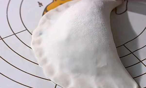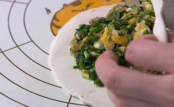 5.餡料處理好後,把剛剛面團取出,放在案板上揉幾分鐘,隨後分成均勻的小劑子。取出一塊面團,用搟面杖搟成薄薄的面皮,取出適量的餡料放在面皮中。用手將面團的四周捏好;