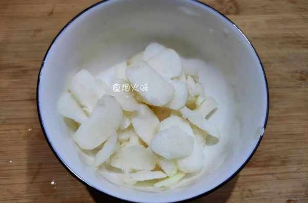 2.去皮後的馬蹄再次放水中洗洗,洗凈放案板上切成細片,切好的馬蹄放碗中備用。