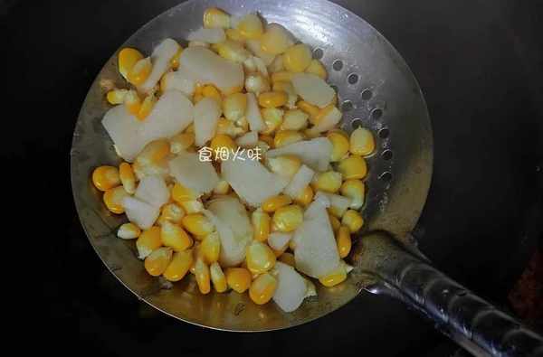 6.我們采用的是甜玉米,很容易就可以煮熟,馬蹄也是可以直接生吃,食材在鍋中焯水1-2分鐘就可以。焯水後的玉米粒及馬蹄用漏勺撈出。