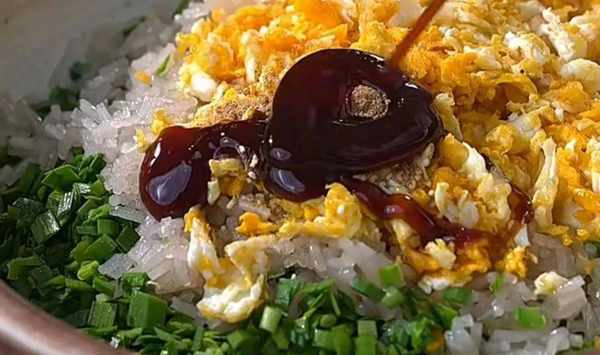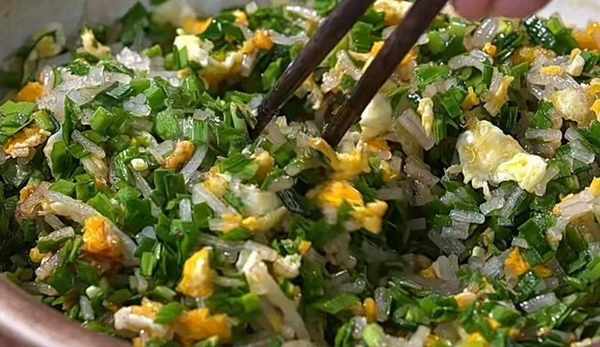 雞蛋的表面洗凈,洗凈的雞蛋打入碗中,用筷子將它們攪散;熱鍋中加入適量的油,熱油後將雞蛋液倒入鍋中炒熟;隨後將米粉,雞蛋塊,雞精,蠔油,食鹽,十三香,食用油倒入韭菜葉中;