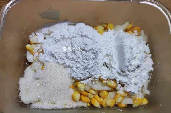 9.我們準備玉米淀粉及糯米粉量是1:1,適量白糖,倒入準備好的粉。(這些粉的量要根據玉米粒跟馬蹄的數量決定要倒入的粉多少)