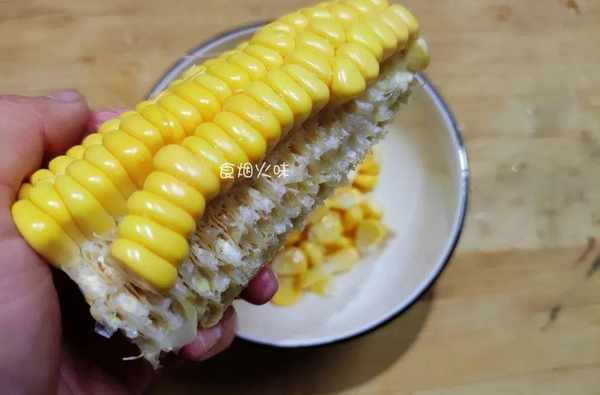 3.玉米去掉表面的玉米皮,準備一把小刀沿著玉米粒生長橫線切好一條線,把這排玉米都掰下來,後面的玉米就可以沿著這條線直接一撥開,很快玉米粒就脫落,脫粒的玉米粒放盤中。