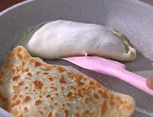 8.中小火將鍋中的食材煎至兩面焦黃的狀態後即可。如下圖,鍋中的餅金黃色,看著著實誘人,表皮酥脆,裡面還有滿滿的鮮香味。