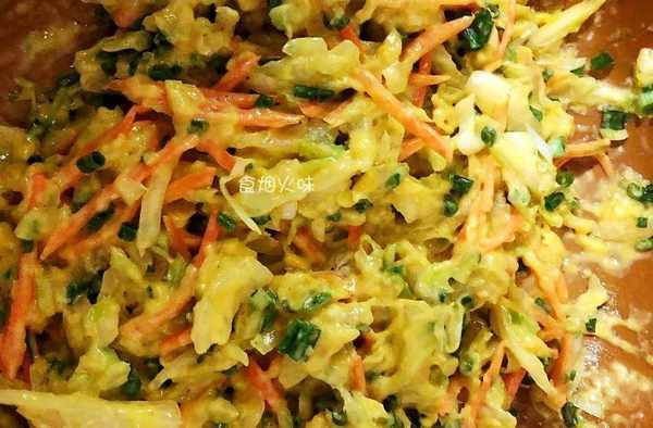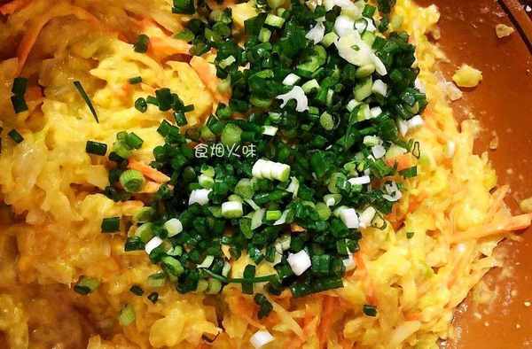 1.將準備好的包菜放在水中洗凈,小蔥也洗凈。洗凈後的小蔥切細,包菜也盡可能地切細狀。切好的包菜放在盆中備用。