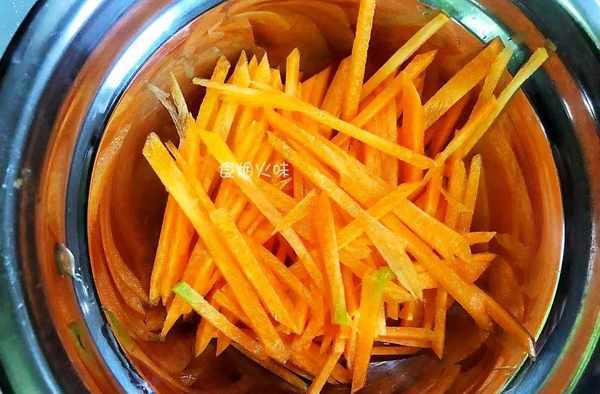 3.準備的胡蘿卜絲放著洗凈去皮,將它切成細條狀,或者用擦絲器將它擦成細絲。