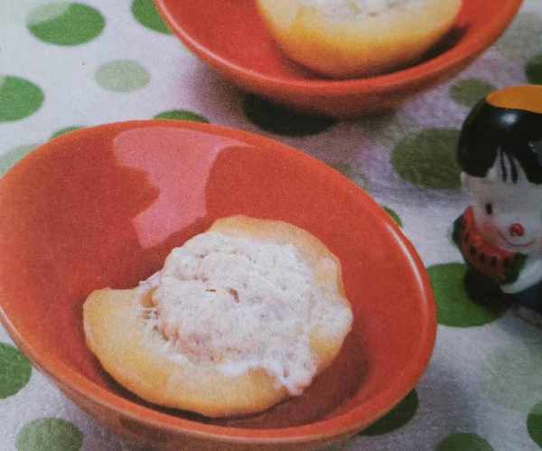 3、把餡分別填入蘋果去核後的凹槽中,擺放入盤,上蒸籠蒸15分鐘,取出澆上蘋果汁即成。