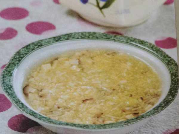 1、豆腐切小塊,略泡;冬菇攪成茸,和豆腐煮滾,下香油、鹽調味,用濕淀粉勾芡成豆腐羹;