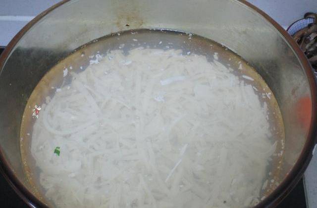 3.之後湯鍋裡加入一大碗清水,加蓋大火燒開後先把豆腐絲入鍋大火燒開。