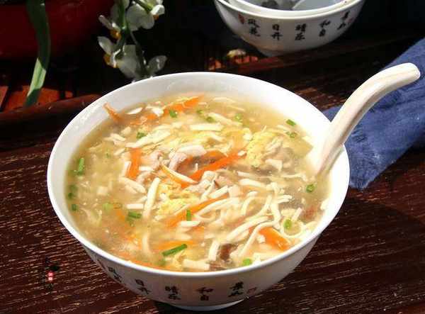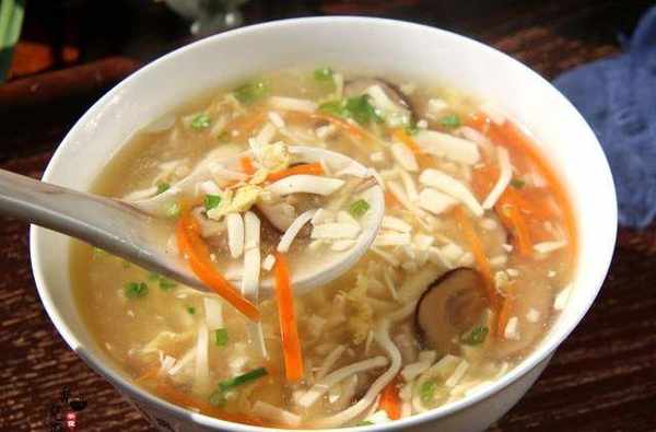 酸辣湯裡面豆腐和雞蛋是最不能少的,裡面除瞭豆腐和雞蛋外,還需要加入瞭香菇,胡蘿卜絲和豬肉絲,豬肉絲要提前上漿醃制,這樣使得肉絲的口感鮮美滑嫩。用香醋提酸,胡椒粉提鮮辣味。出鍋前打起蛋花後再用水淀粉勾成薄薄的芡汁,吃的時候入口酸,回味就是一點微微的辣,滋味鮮美,酸辣開胃,超級的好吃。
