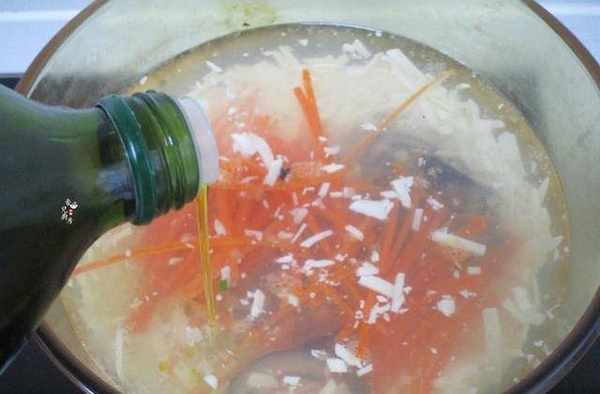 4.之後再把胡蘿卜絲和香菇絲入鍋,再加入橄欖油,也可以用其它熟油,繼續大火燒開。