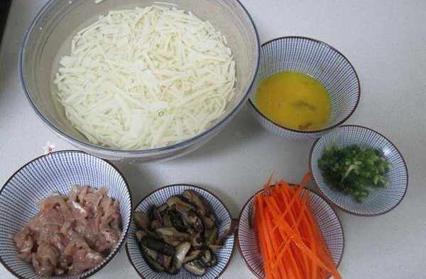2.把豆腐切成細絲後再放入大碗裡用流動水漂洗幹凈後泡入清水裡,雞蛋磕入碗裡攪拌成蛋液,小蔥洗凈切成蔥花,豬肉切絲後加入黃酒,鹽和淀粉抓勻後醃制15分鐘以上,胡蘿卜去皮洗凈切絲,香菇泡發後洗凈切成絲。