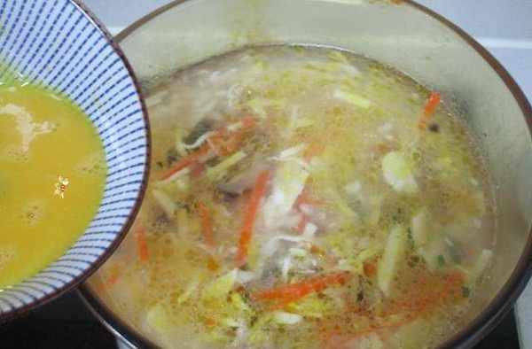 5.之後先把豬肉絲用筷子挑起分次入鍋後拌勻,等肉絲變色後就把蛋液入鍋。先熄火,把蛋液慢慢地繞圈倒入,這一步很關鍵,利用鍋內的溫度倒入的蛋液才能出蛋花狀。