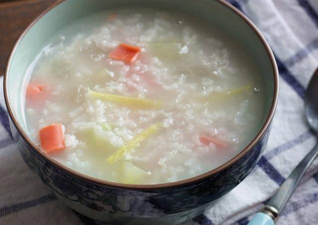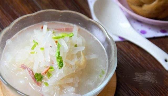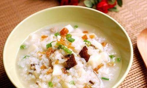 【材料清單】稠粥1碗,白蘿卜30克,火腿75克,高湯750毫升,香菜末、味精、胡椒粉各適量