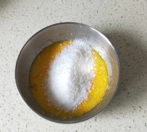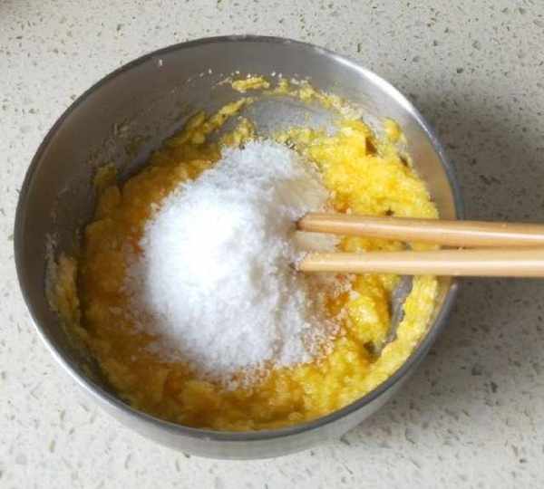 第7步、攪拌均勻的雞蛋與黃油,加入一半的椰蓉拌均勻。