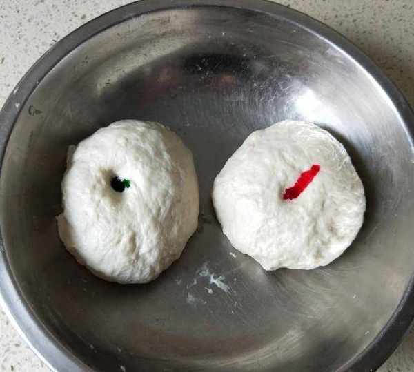 第3步、揉成的面團分成2等份,分別加入紅色素、綠色素。