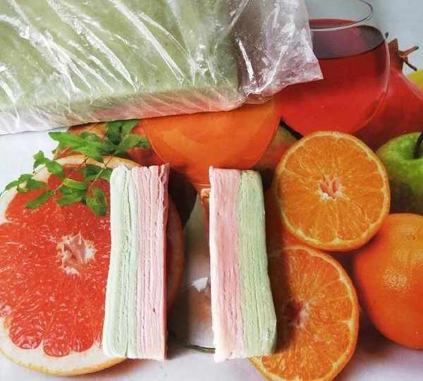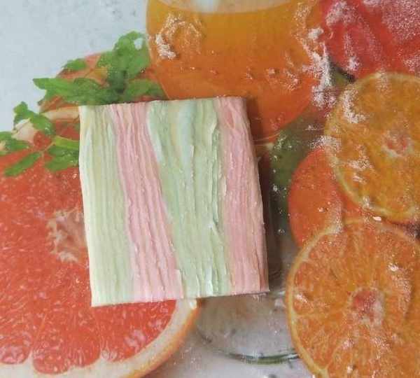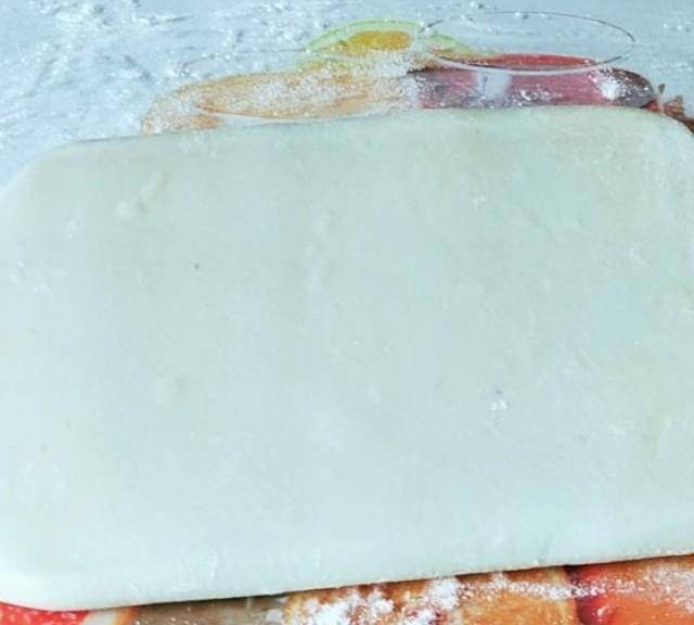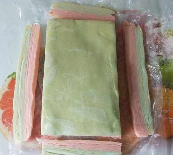 第18步、將兩種面重疊,放冰箱冷藏一下,稍硬取出切除四邊餘料。