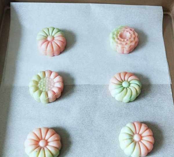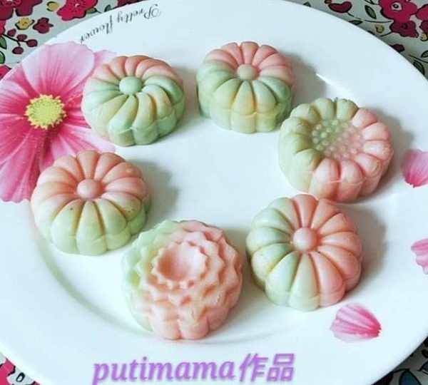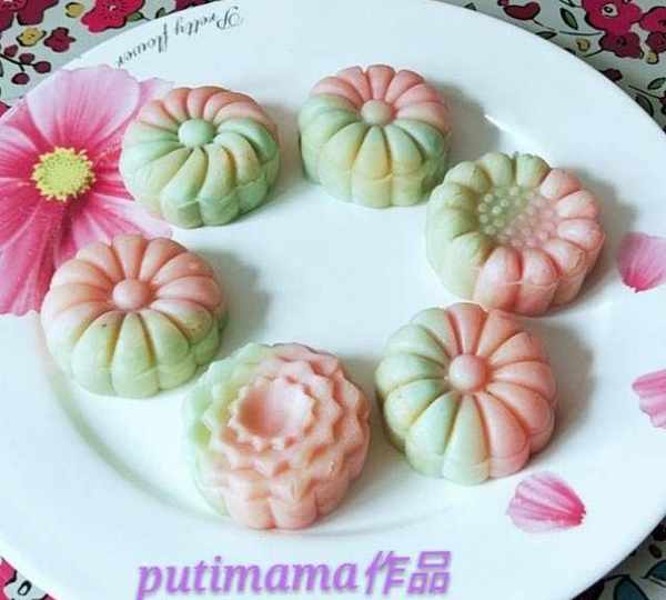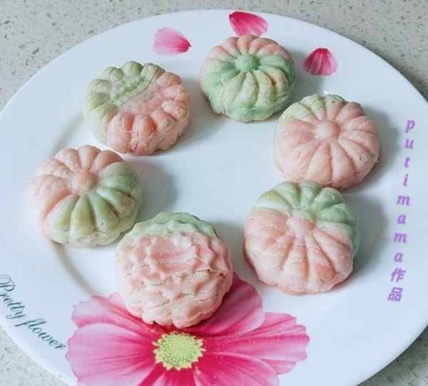 原料:面粉、豬油、水、紅色食用色素、綠色食用色素、黃油、雞蛋、白糖、椰蓉、面粉。