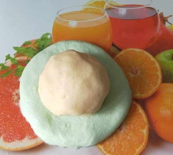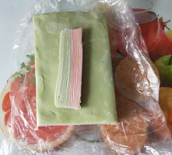 第12步、將綠色水油面包入油酥面收口朝下。