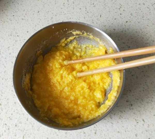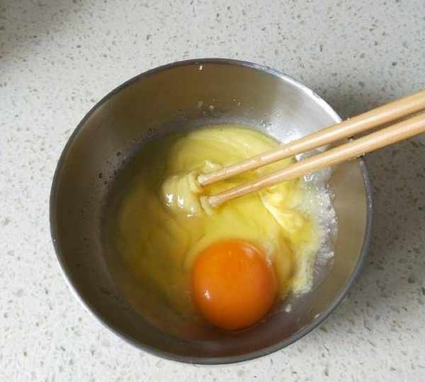第6步、餡料:先軟化黃油、加入白糖攪拌均勻、再打入1個雞蛋。