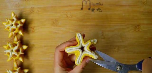 我們取一白一黃兩個面積先分別揉勻,搟成圓皮。再疊放在一起,面皮直徑約10厘米,先把面皮捏出5個大小一致的腳出來。捏好瞭以後用剪刀在每個角上剪一次。剪好後把每個角上的第二個小角與相鄰的第三個小角捏在一起。一次捏好以後整理一下即可,做好後放入鍋裡,二次醒發15分鐘,醒好後小火蒸15分鐘。