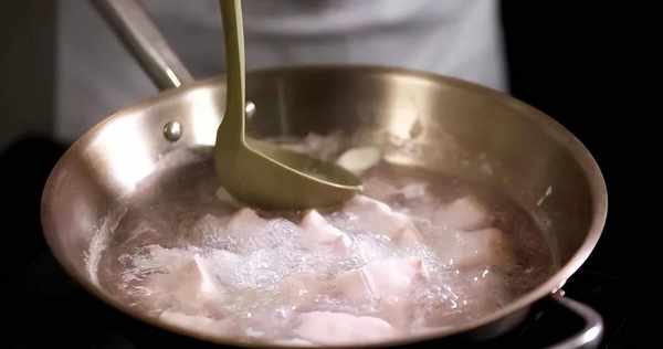 3、再來上一點點高度白酒,先把板油煮一煮,時間不用太久,煮開瞭之後,把浮沫給刮幹凈,再撈出來,蔥薑不用給它夾掉。