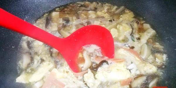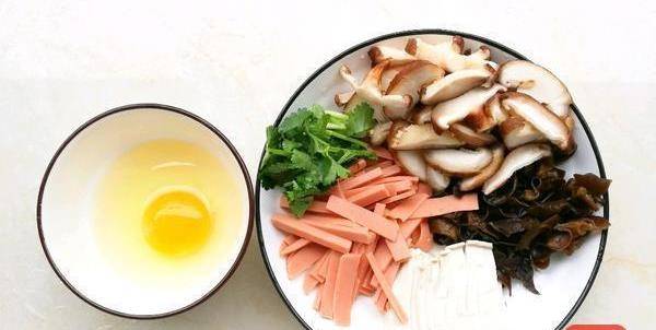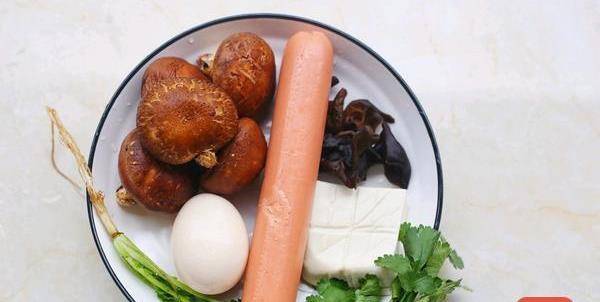 6輪香菇,1塊豆腐,木耳10g,雞蛋1個,火腿半瓶,香菜1根