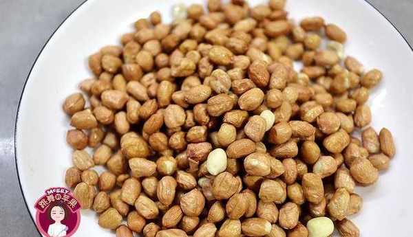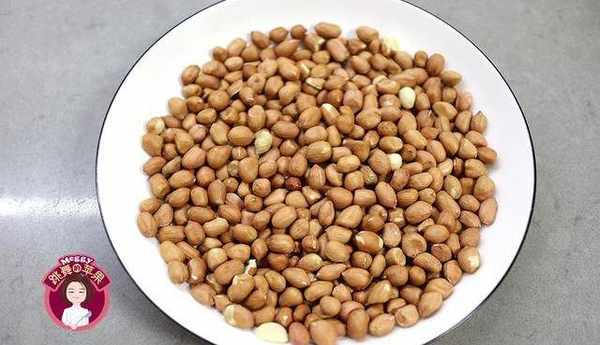 2.先用涼水將花生米淘洗2遍,洗掉表面的浮塵,再用涼水浸泡1分鐘,就1分鐘噢,隻把表皮泡皺皺,而花生米還沒有吸水;