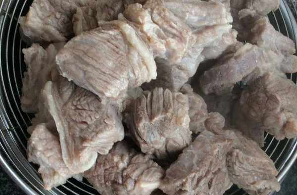 2、起鍋,冷水放入八角,蔥結,薑片,牛腩煮沸,撈出清凈瀝幹,