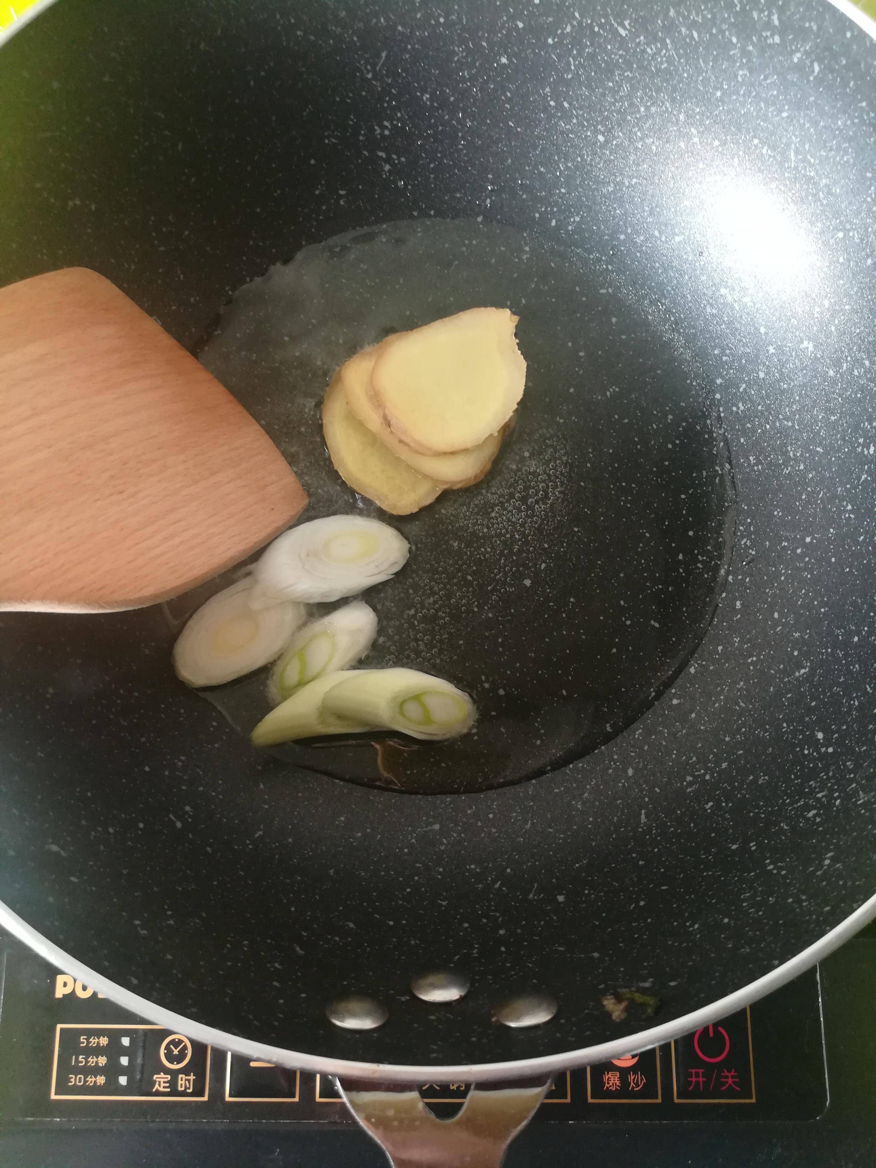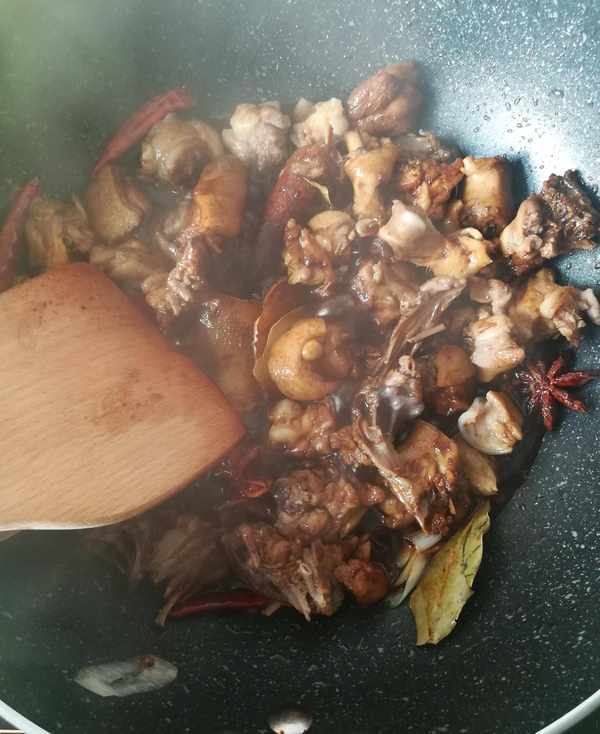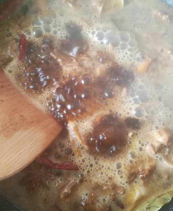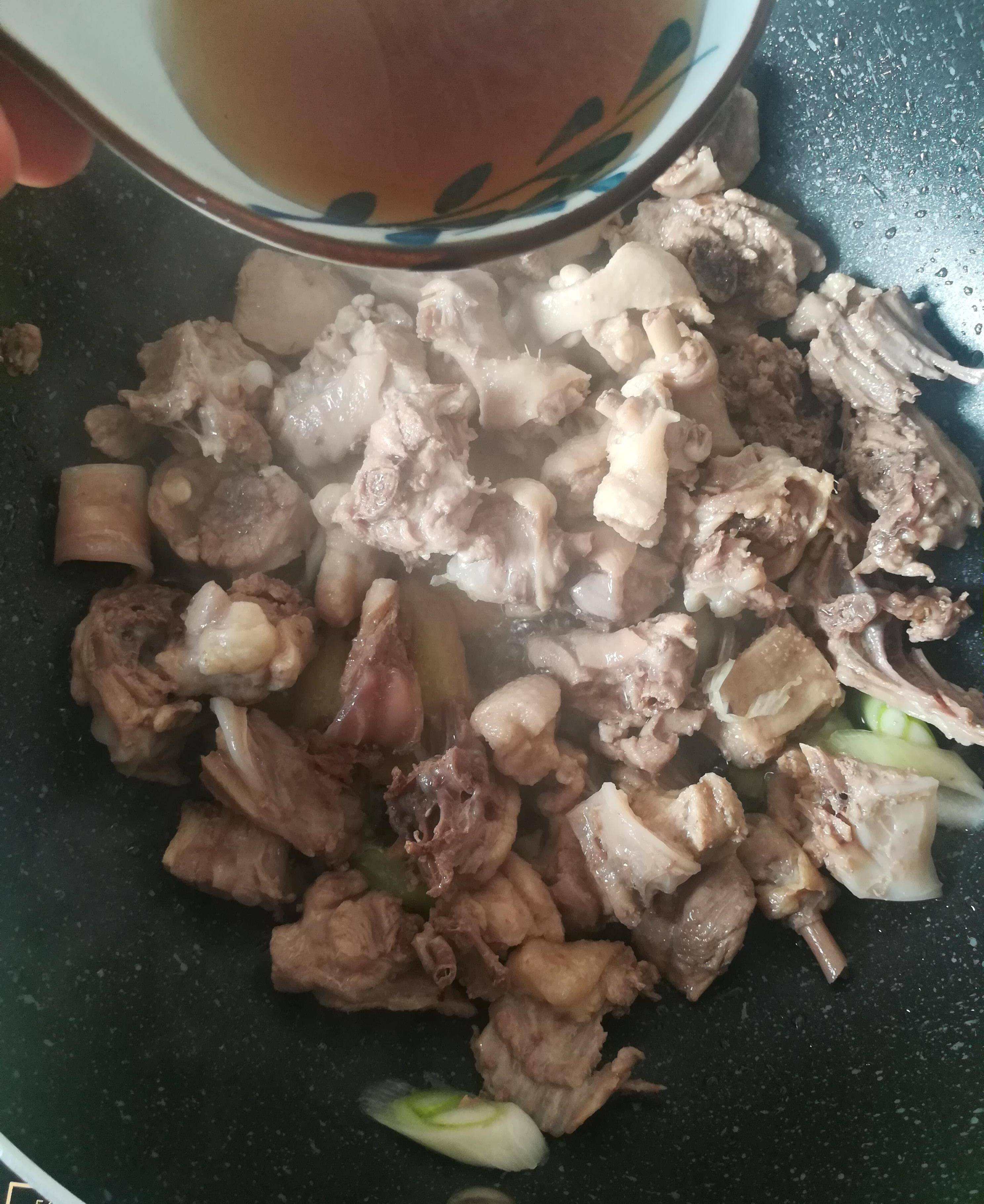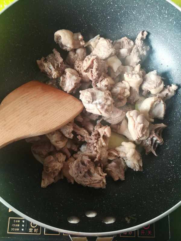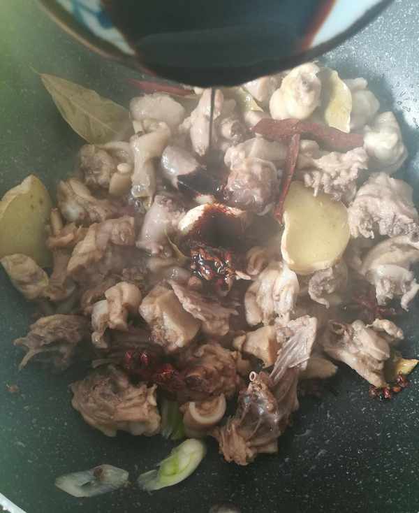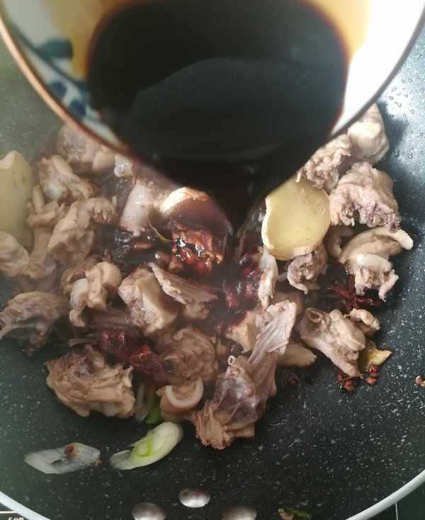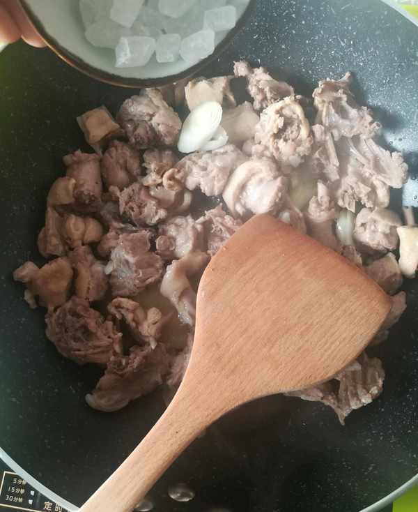 第二步:鍋裡加入底油下切好的蔥,薑片和鴨肉塊,適量的冰糖,料酒,適量的花椒,大料,幹辣椒,桂皮,香葉開大火翻炒出香味如圖