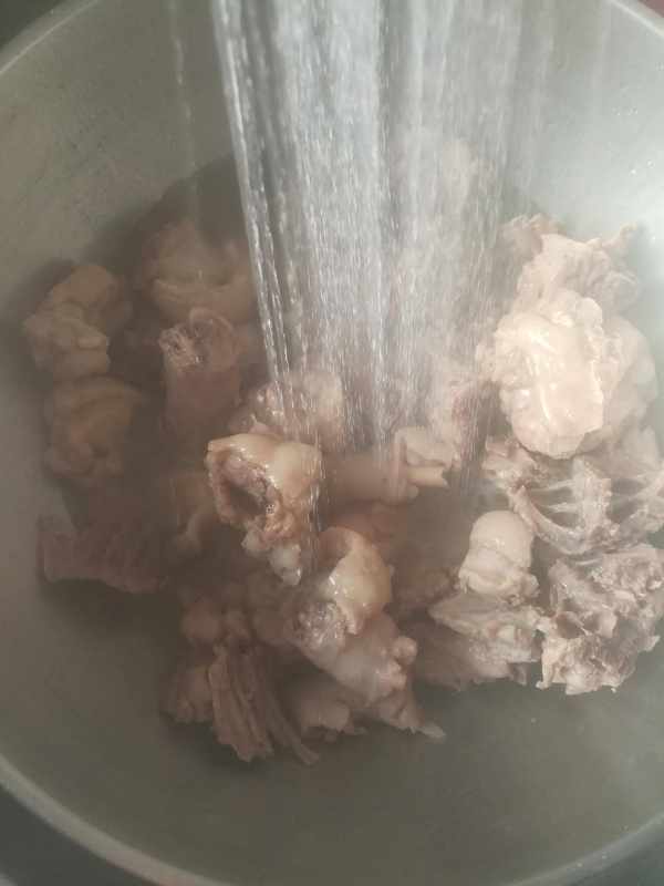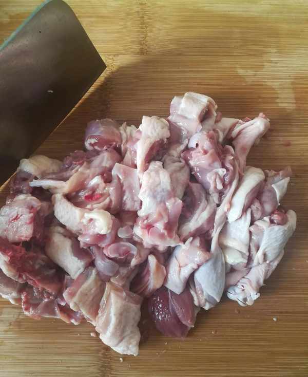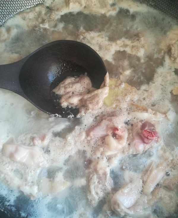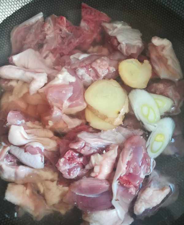 第一步:鴨子洗凈剁成塊,鍋裡加水,水開煮切好的鴨塊5分鐘,去除血沫撈出,沖涼水後控幹水分備用如圖