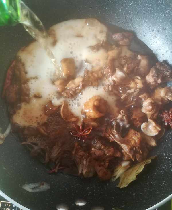 第三步:鴨塊翻炒均勻後再加入老抽,生抽和少許的鹽繼續翻炒後,加入一瓶啤酒大火煮開,蓋上鍋蓋改中小火燉20分鐘左右如圖