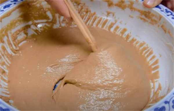 2.倒入300g的低筋面粉,3g的小蘇打,2g無鋁泡打粉,3g的酵母粉,紅糖水現在晾涼瞭,我們直接用它來和面,攪拌成細膩粘稠的面糊。