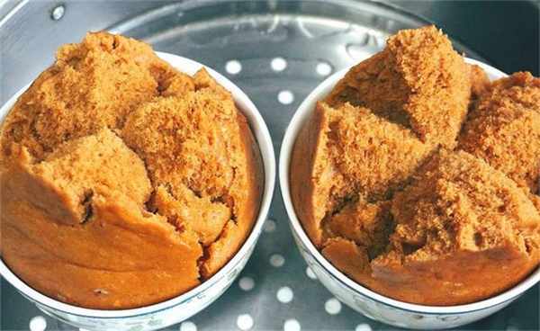 5.把發糕取出來,咱們這一次做的這個發糕特別的簡單,主要是不用等發面的時間,比較快手版的一種做法,這個是裡面添加瞭泡打粉,它可以加速酵母發酵,沒有的話可以不放,換成白糖也可以,大傢在做的時候一定要註意,我們這個面糊不要調得太稀瞭,還有一個是和面的時候,一定要把紅糖水晾到溫熱再開始和面,全程用大火蒸,分分鐘就可以開花,特別簡單,大傢喜歡的可以試一試。