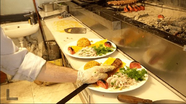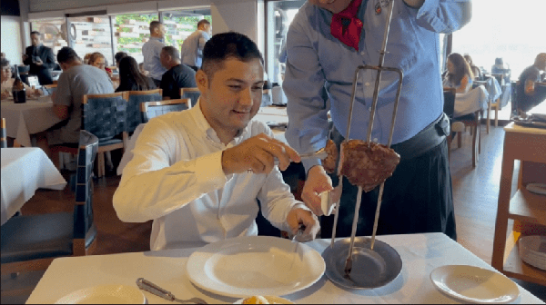烤肉是門技術,吃肉是門學問。服務生一手拿著雪亮鋒利的尖刀,一手舉著半米多長的烤肉叉在餐桌間遊走。顧客隻需用手一指,服務生立刻手起刀落,麻利地削下一大塊放入盤中,讓人充分體驗大口吃肉的快感。