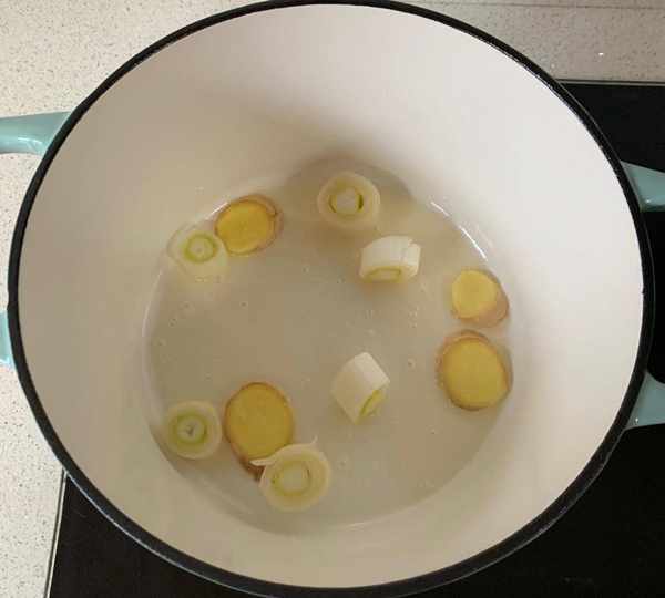 湯鍋中倒少許油,下蔥段,薑片爆香