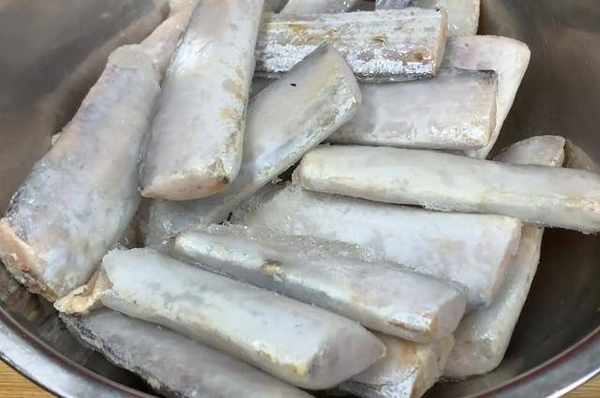 準備適量的帶魚段倒入盆中,加入清水把帶魚段,浸泡十分鐘。