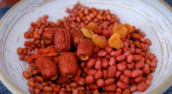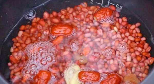 準備300克提前浸泡好的紅豆,加半碗紅皮花生,十幾粒紅色枸杞,六顆大棗,幾粒幹桂圓,加入清水反復淘洗幹凈。