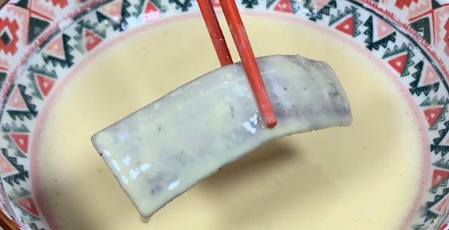 再來調個面糊,大盆中加入兩勺面粉,兩勺淀粉,一勺食鹽,攪拌均勻。攪勻後打入兩個雞蛋,少許白醋,攪拌均勻,最後調成細膩有點像酸奶狀態的面糊。把醃好的帶魚放到面糊中,裹上薄薄的一層面糊就可以。
