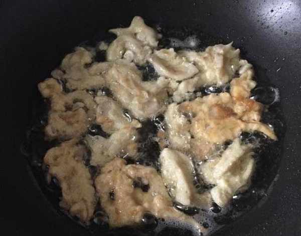 5.在鍋中熱油,油溫七成熱,把掛好面糊的平菇放進去,小火慢慢炸,一次不要放太多,以免粘連,炸至金黃色就可以出鍋,靜止一會控油。