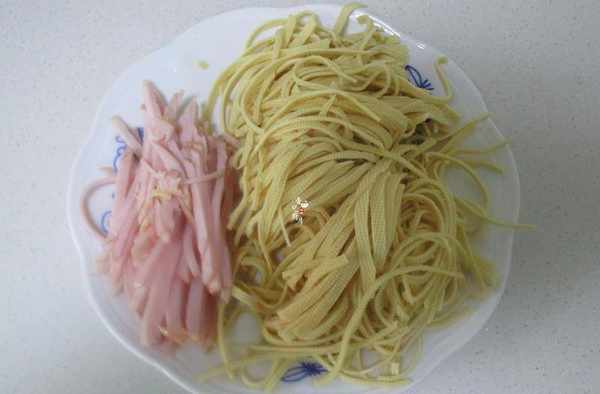 2.把火腿片和薄百葉分別切成細絲,薄百葉有三種,這種是中等厚薄的最適合做湯菜,口感好還容易入味。